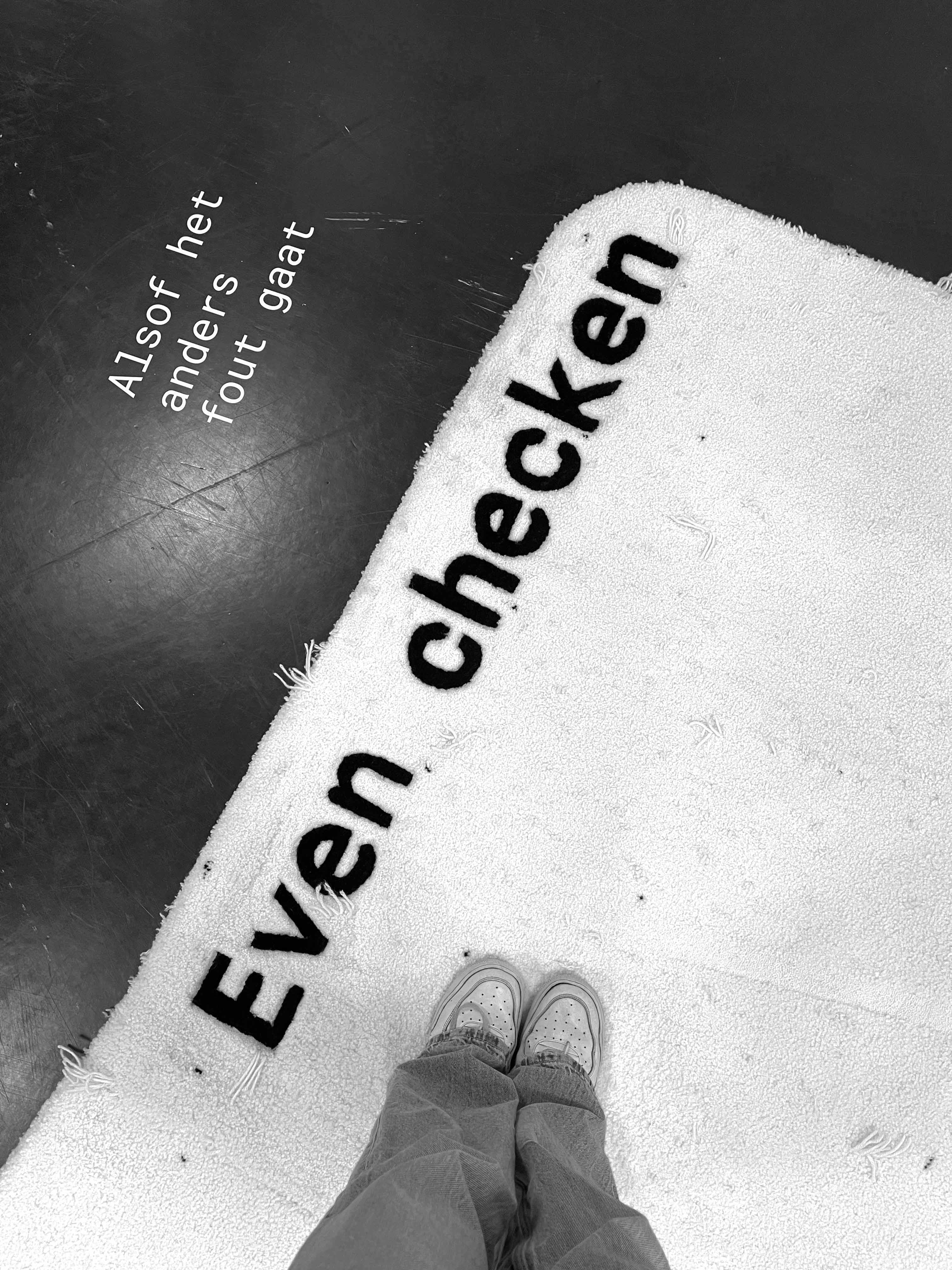 “Alsof het anders fout gaat” is een ruimtelijk tapijt dat letterlijk in de weg ligt. Wie eroverheen loopt laat sporen na. Dat roept frustratie en ongemak op. Dit werk weerspiegelt de tegenstrijdige gevoelens die kunnen ontstaan bij dwanggedachten. Door het onvermijdelijke betreden van het werk ontstaat een kleine, tastbare ervaring van wat OCD (obsessieve dwangstoornis) voor iemand kan betekenen.