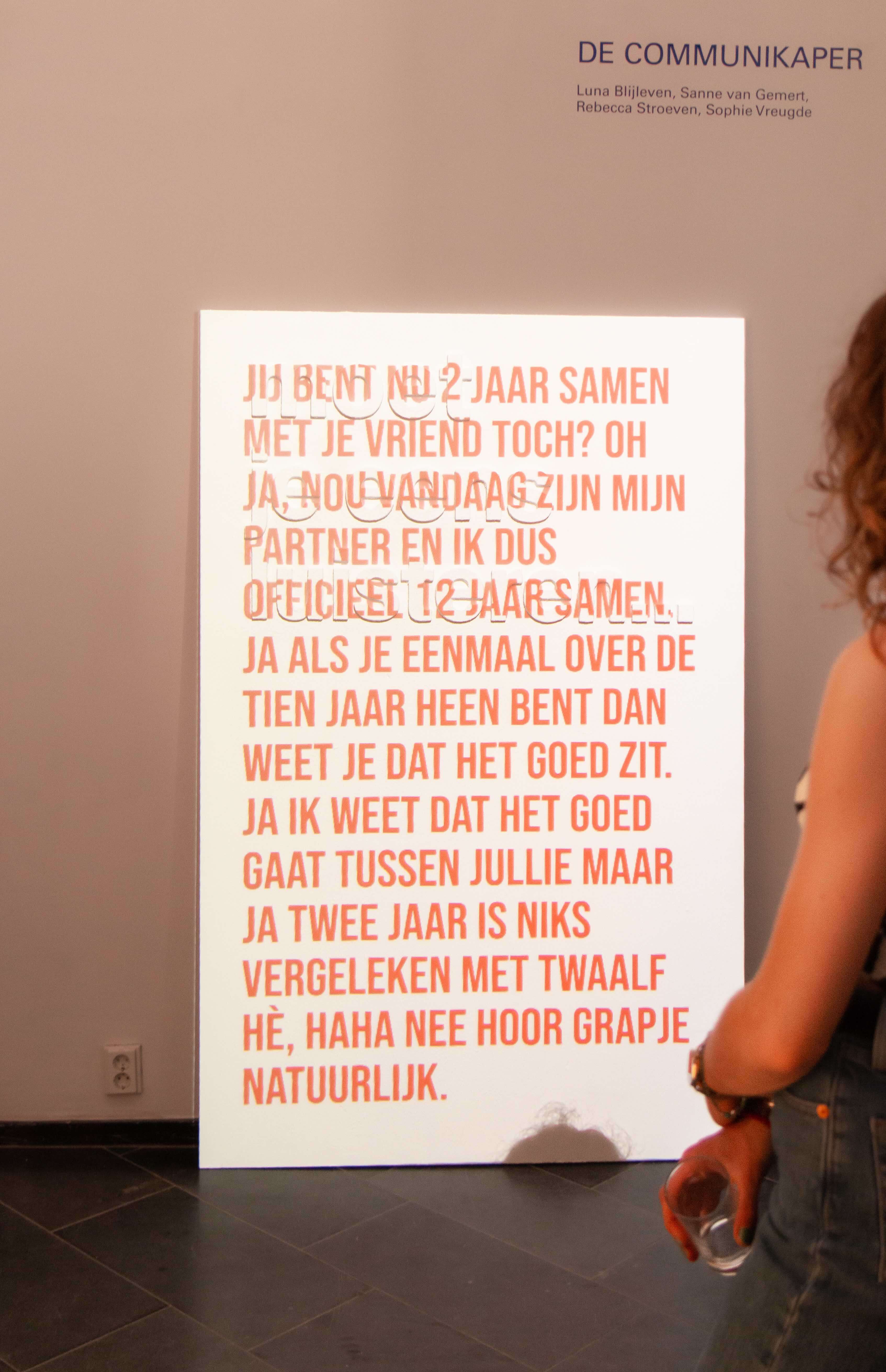 Sommige mensen beginnen al snel over hun eigen problemen als anderen hen iets proberen te vertellen. Het werk ‘De communikaper’ staat centraal voor deze communicatiekapers. Veel mensen doen dit wel eens, vaak zonder dat ze het doorhebben. Het kan ervoor zorgen dat er misverstanden ontstaan en soms is het ook gewoon erg frustrerend. Het werk zet de toeschouwer aan het denken over de gesprekken die we voeren door middel van het projecteren van herkenbare teksten.